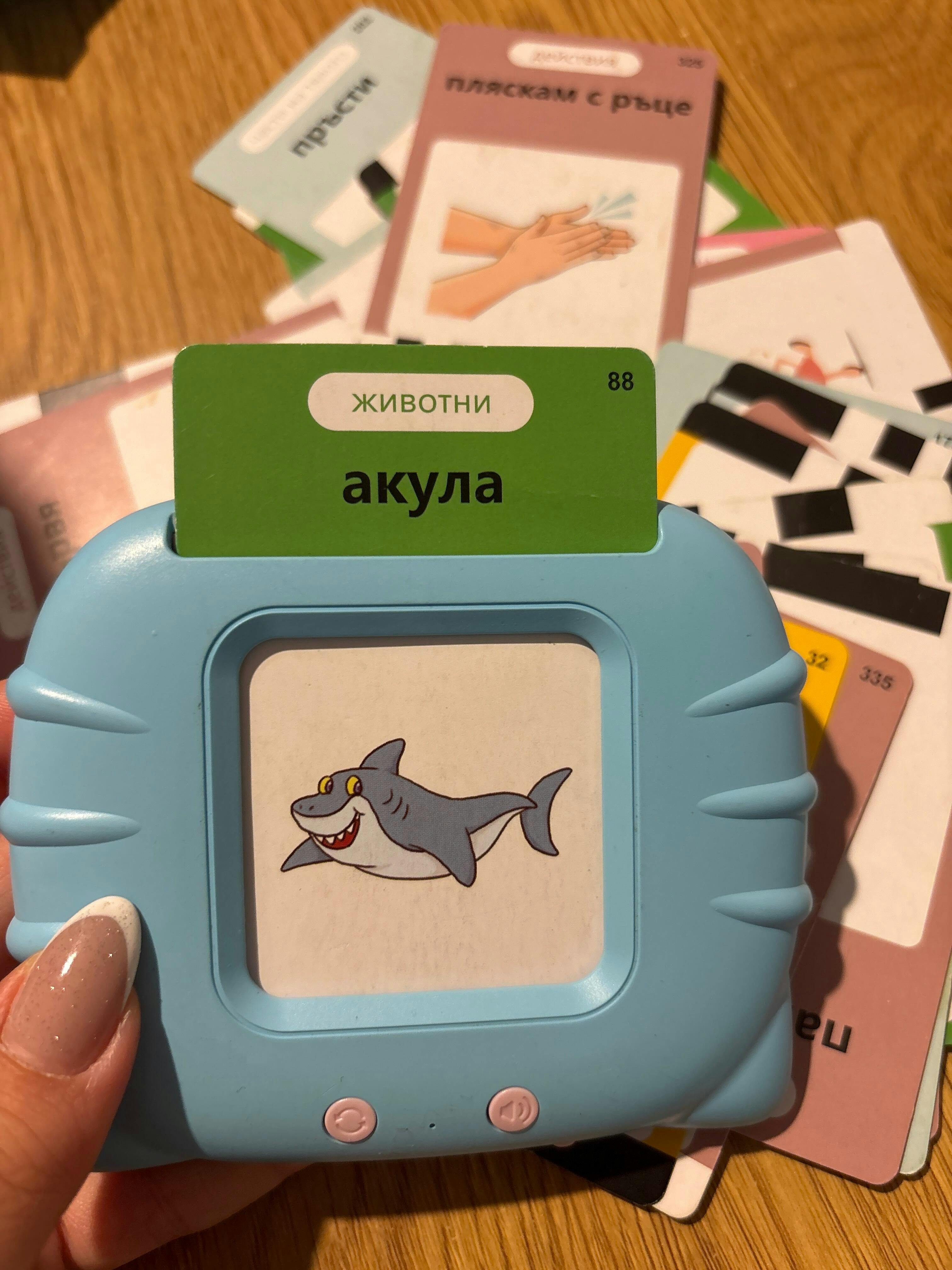 Бях виждала подобен продукт преди, но беше само на английски. Като видях, че вече има и на български език, нямаше как да не взема. Синът ми успя да повтори обратно 10тина нови думи още с първото изпробване. Селекцията от думи е доста пълна, особено с допълнителните декове. Гласът, който изговаря думите е ясен, а звукът може да се регулира. Режимът, в който казва думите и на английски език (след като ги каже на български), също е полезен.